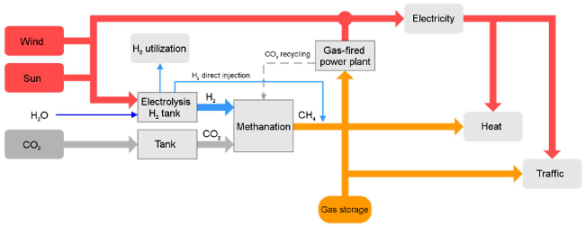 The fact that the percentage of renewable energy production is still increasing, leads to a higher fluctuation in the international energy production. Taking into account that the energy consumption is also variable leads to a high volatility concerning capacity and price of electric current. Already seasonal fluctuations in energy production are reaching the capacity limits of nowadays power grids. Stable prices and optimal usage of the existing grid capacity are only achievable by generating a constant utilisation of power grids. An example of how to achieve this goal is temporary storage of electrical power. Today’s solutions are limited by number of different factors – limited capacity (batteries, capacitor), missing practicability (fly wheel, compressed-air storage), a reduced number of possible operation sites (pump storage) and also high costs. In this context Power-to-Gas (P2G) offers a huge potential. Hydrogen produced by electrolysis using excess energy is combined with carbon (mostly CO2 produced by power plants, industrial or biogenic processes) and chemically or biologically transformed to methane. After appropriate gas purification this gas can be fed to the natural gas grid. In addition to methane there is also the potential option to directly feed hydrogen to the natural gas grid, which is currently examined. Assuming renewable energy resources sum up to 80% of the total electricity generation current estimations come to the conclusion that the natural power grid offers 8-times the capacity that is needed to compensate for the seasonal fluctuations and is therefore a very potent energy storage option. Furthermore the overall efficiency of the concept electricity-gas-electricity is specified around 40-50%. Extending this concept with liquid energy carriers (e.g. ethanol or butanol) leads to additional synergetic effects. The result is a complex overall concept with many degrees of freedom, leading to lots of options in regards to customization and optimization adapted to the local needs.