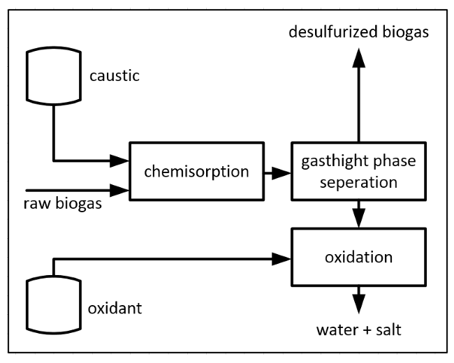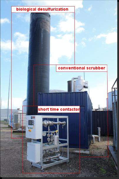 The basic principle of contacting the biogas with alkali hydroxide solution, e.g. sodium hydroxide, is the same as for commonly used chemical oxidative scrubbing processes. Instead of a basic column a special short time contactor is used. This offers multiple advantages compared to other commercial systems. It intensifies the contact between the biogas and the liquid scrubbing solution, while reducing the needed space. Due to the very short and well-adjusted contact time it is possible to achieve an excellent selectivity for the absorption of hydrogen sulphide compared to carbon dioxide. The reduced carbon dioxide absorption leads to a decreased consumption of the used chemicals. In the next step the two phase system of biogas and scrubbing liquids is separated and the biogas leaves the treatment plant mostly free of scrubbing liquids. The loaded scrubbing chemicals are then fed to an oxidative treatment step (e.g. using hydrogen peroxide) and the absorbed sulphur is converted to non-dangerous aqueous sodium sulphate solution.