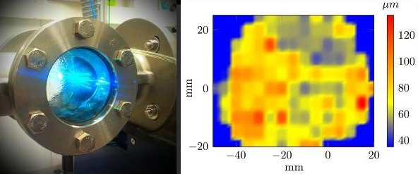 Figure 2: Left: Examination of the biogas scrubbing liquid mixture using a laser based flow measuring technique; Right: Example for the droplet size distribution in the contactor