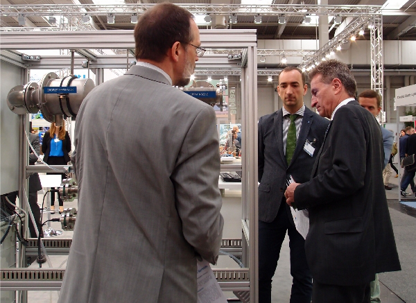 Figure 6: Presentation of the SHOCOTEC prototype and the process concept at the TU Wien shared booth at the Hannover Messe 2014, visit of the European Commissioner for Energy Günther Oettinger