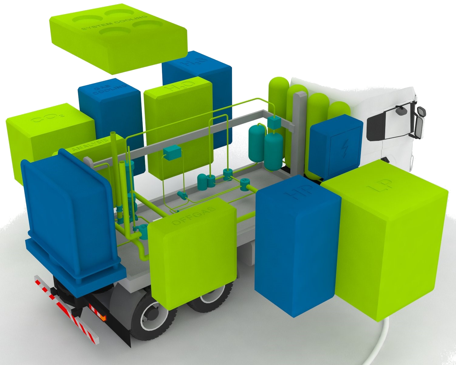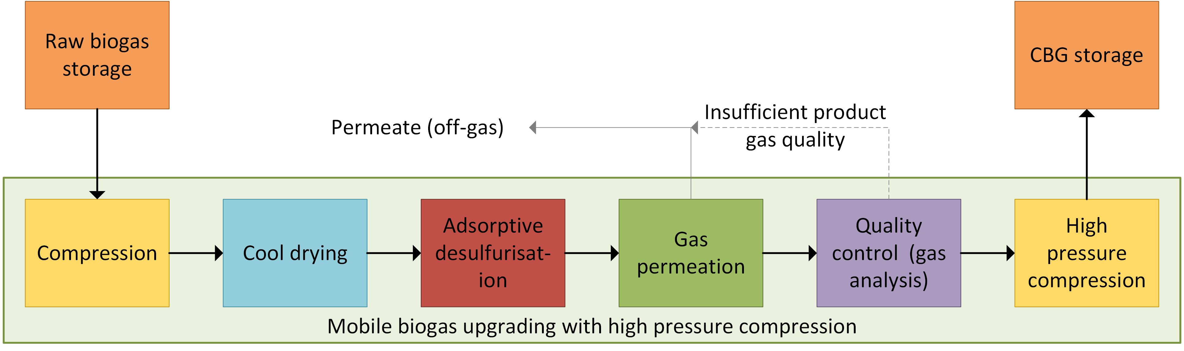 Due to raw biogas compositions and further requirements, like low space and weight demand, short start up time, low energy demand and low costs, membrane process was chosen for the removal of CO2, which is the main upgrading step. Additionally, two further pre-treatment steps were defined: cool-drying for the removal of water vapor and potential ammonia and an adsorption step with two different adsorbents for desulphurization and removal of minor impurities like O2 and siloxanes. Due to extremely high H2S concentrations in raw biogas originating from manure, biogas plants using manure as substrate need an additional stationary pre-desulphurization before the biogas can be upgraded in the mobile plant.